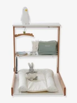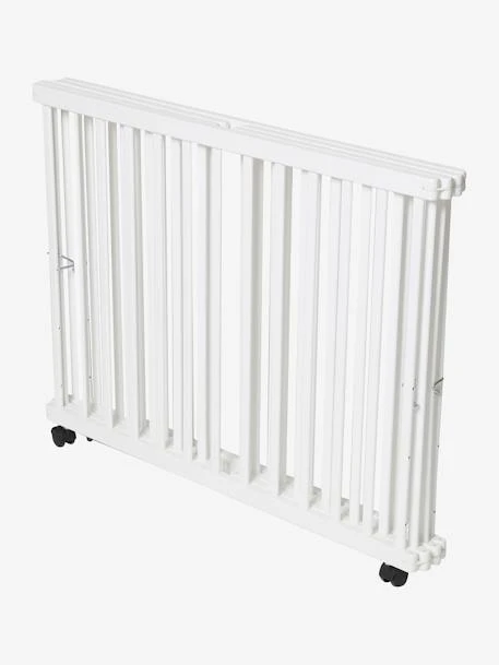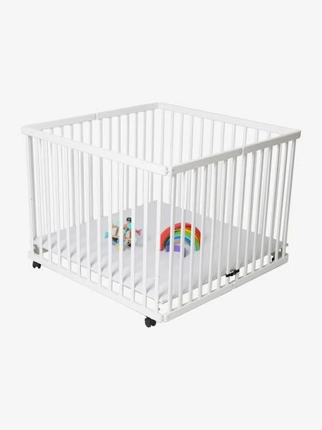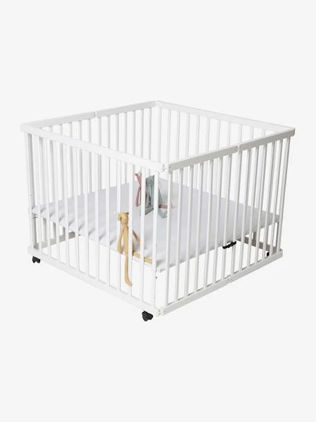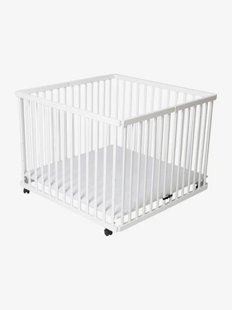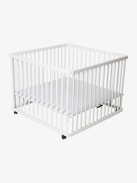 Parc pliant VERTBAUDET en bois de hêtre. Fond de parc en panneaux aglomérés recouverts de mousse et de PVC. Charnières en plastique.