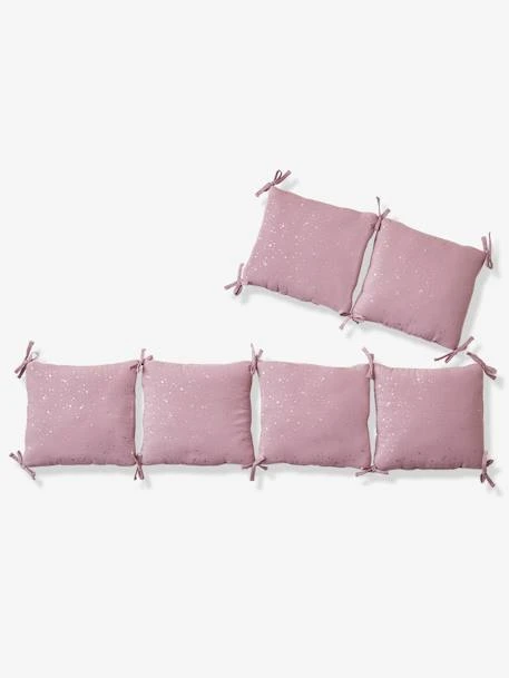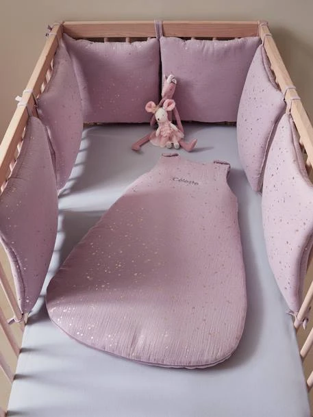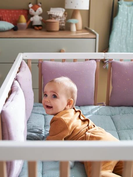A la fois déco, confortable et anti choc, le tour de lit / tour de parc rassure les enfants en les entourant de douceur et en reproduisant le cocon de la maternité. Bébé pourra s’éveiller en toute sécurité, sans risquer de se cogner contre les barreaux. Les éléments modulables se fixent par nouettes et permettent une bonne circulation de l’air.